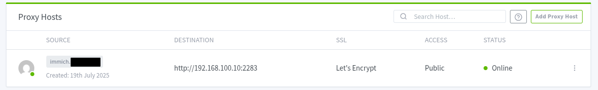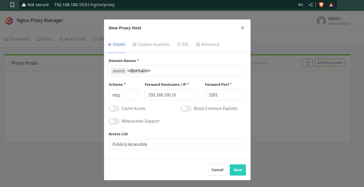 I’ll make a new container on 192.168.100.10, immich, to be our reverse proxy with https://nginxproxymanager.com/guide/#quick-setup
