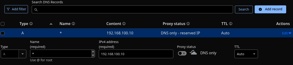 Now we need to make a record to tell Cloudflare where to point when we visit immich.MYDOMAIN, which will be our Nginx server’s internal IP.