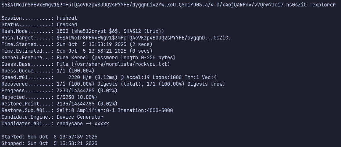 hashcat -m 1800 root.hash /usr/share/wordlists/rockyou.txt