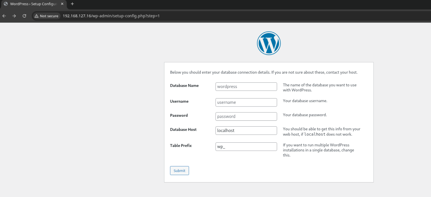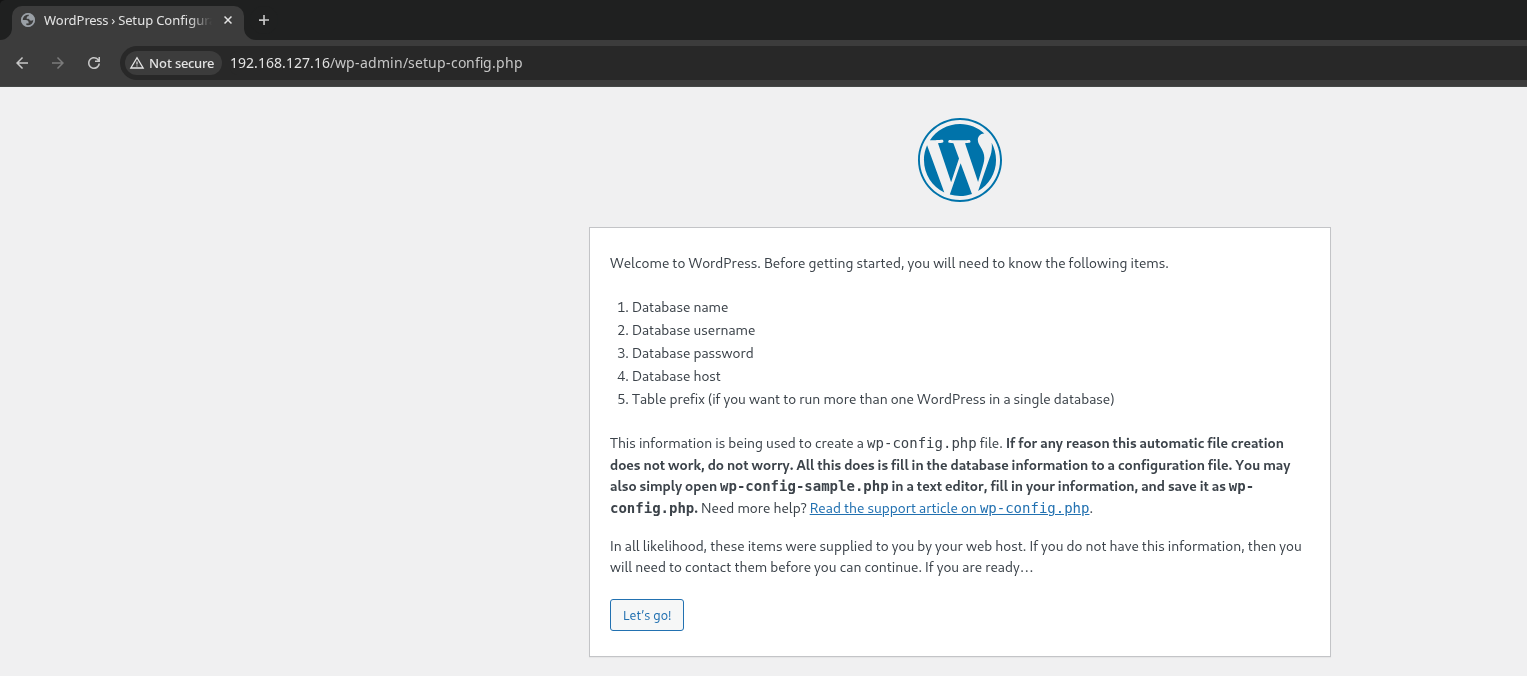 I land on a freshly installed WordPress instance. We don’t have the database credentials, so we can’t move forward.
