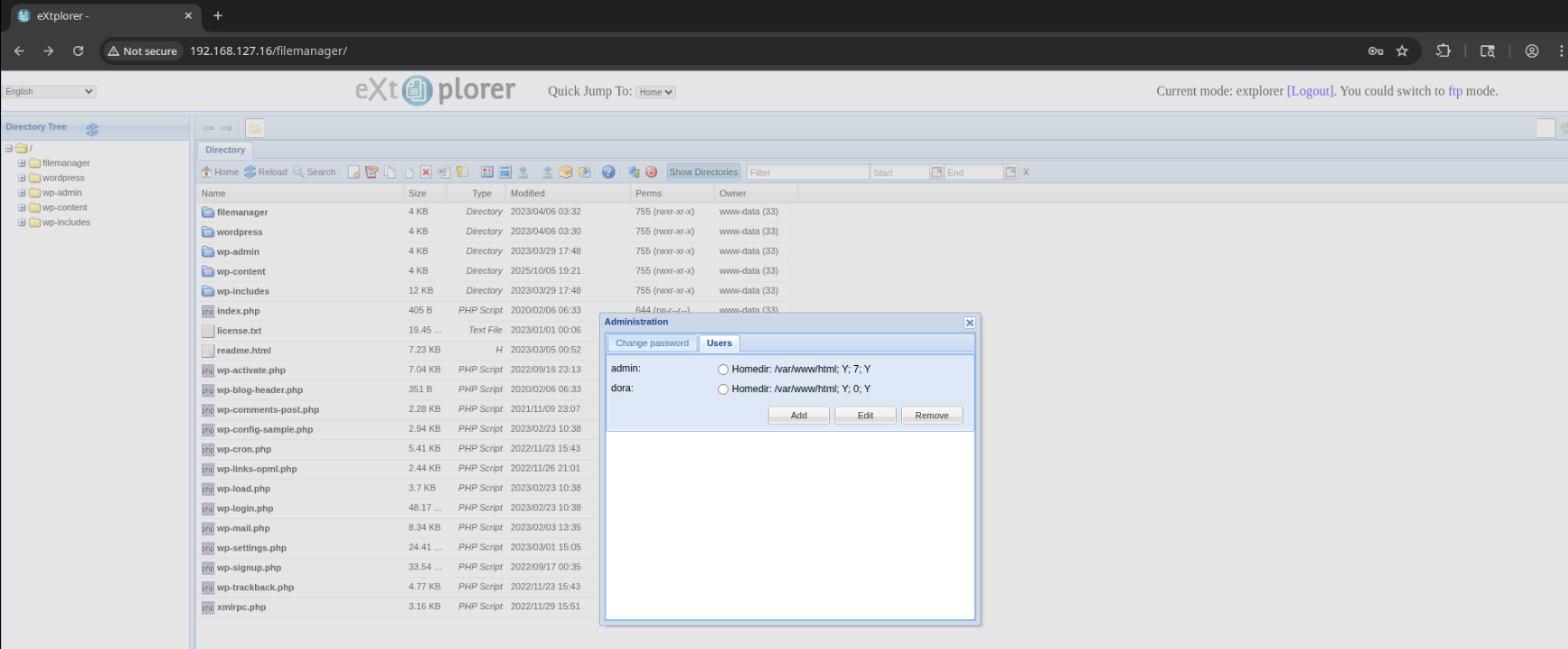 It looks like the users admin and dora both have a home directory of /var/www/html. The directory tree confirms that we have access to the WordPress instance’s webroot.