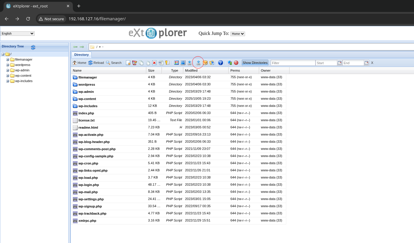 I’ll copy /usr/share/webshells/php/php-reverse-shell.php to my current directory, edit it to use my attacking machine’s IP address, and upload it to the target’s webroot via extplorer’s upload button.