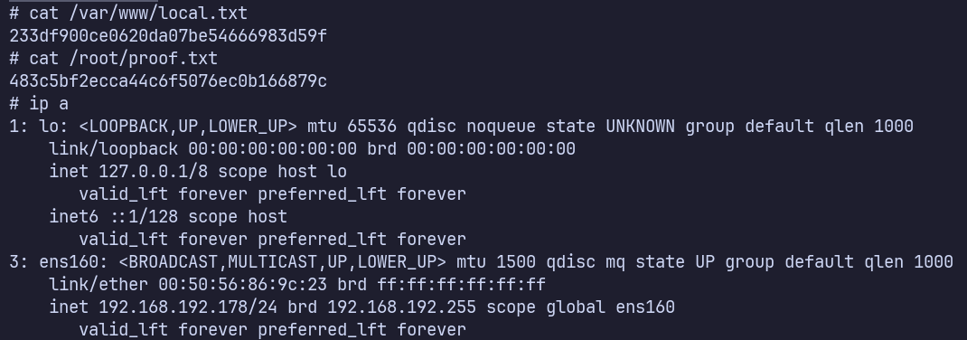 /var/www/local.txt: 233df900ce0620da07be54666983d59f /root/proof.txt: 483c5bf2ecca44c6f5076ec0b166879c