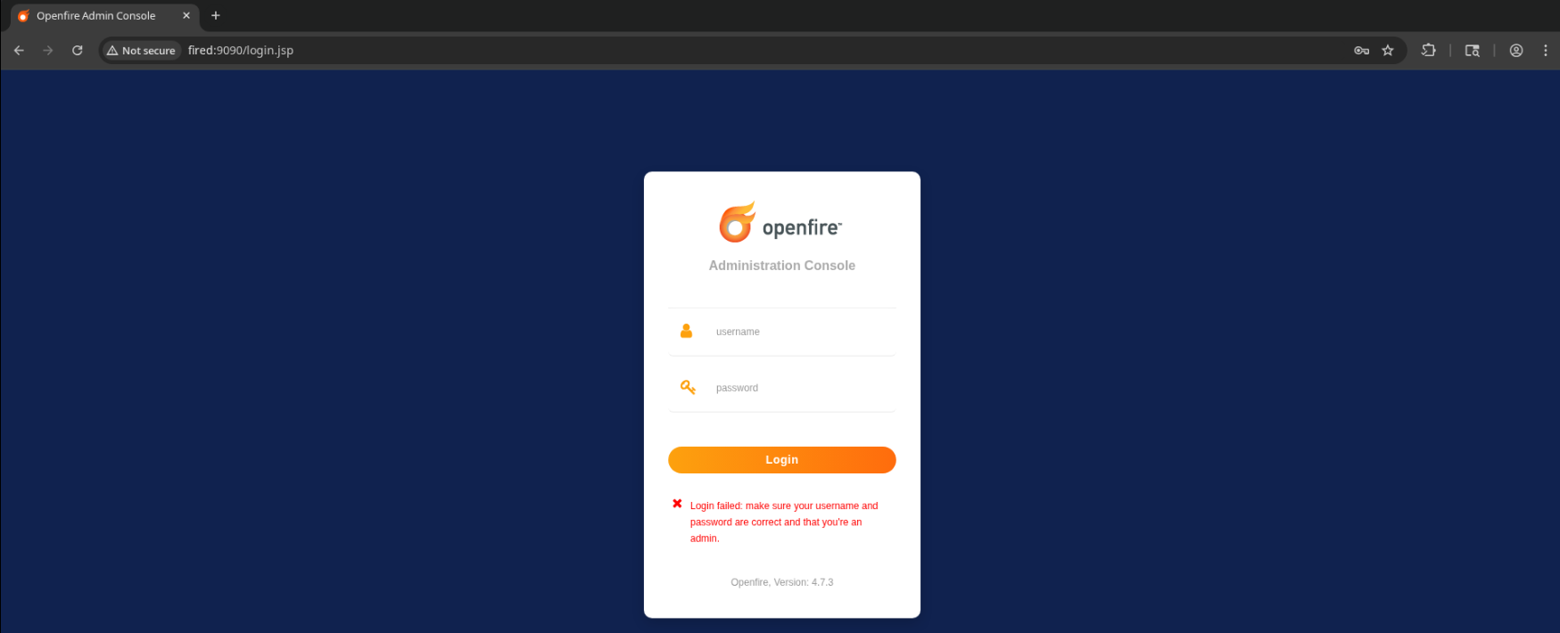 Opening it in a browser, we’re presented with a login form for openfire administration console, version 4.7.3… not tasktracker (always verify findings from automated tools).
