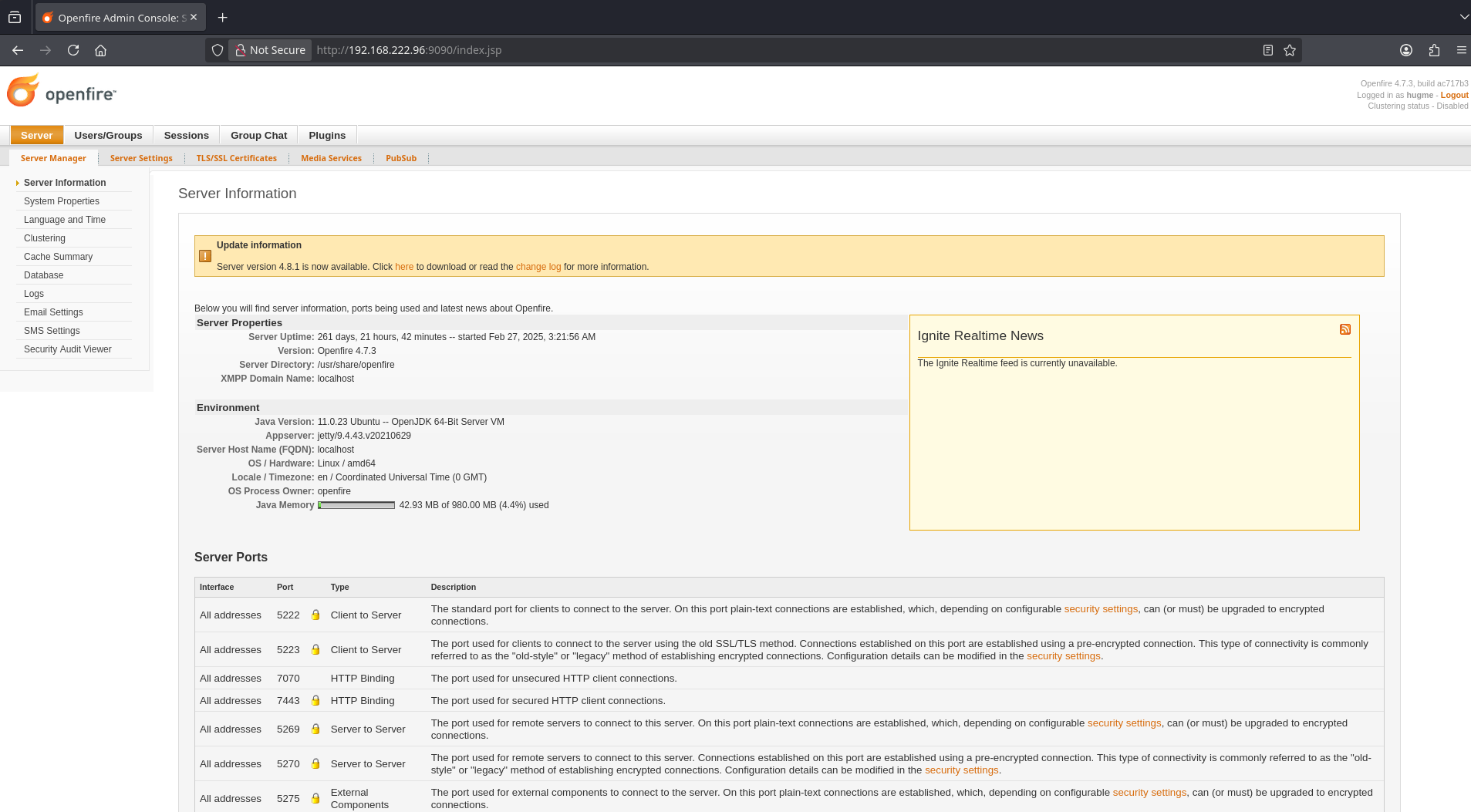Searching the web for Openfire 4.7.3 returns some results about a CVE-2023-32315 which allows authentication bypass. https://nvd.nist.gov/vuln/detail/cve-2023-32315