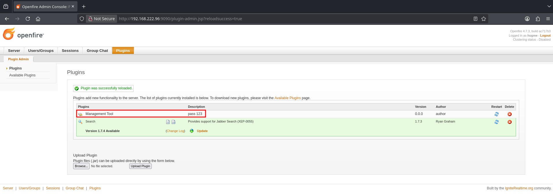 Another POC I tried (which didn’t seem to work for auth bypass, in my case) includes a .jar that we can upload as a plugin to gain RCE. https://github.com/miko550/CVE-2023-32315