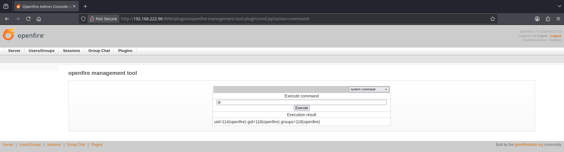 uid=114(openfire) gid=118(openfire) groups=118(openfire)