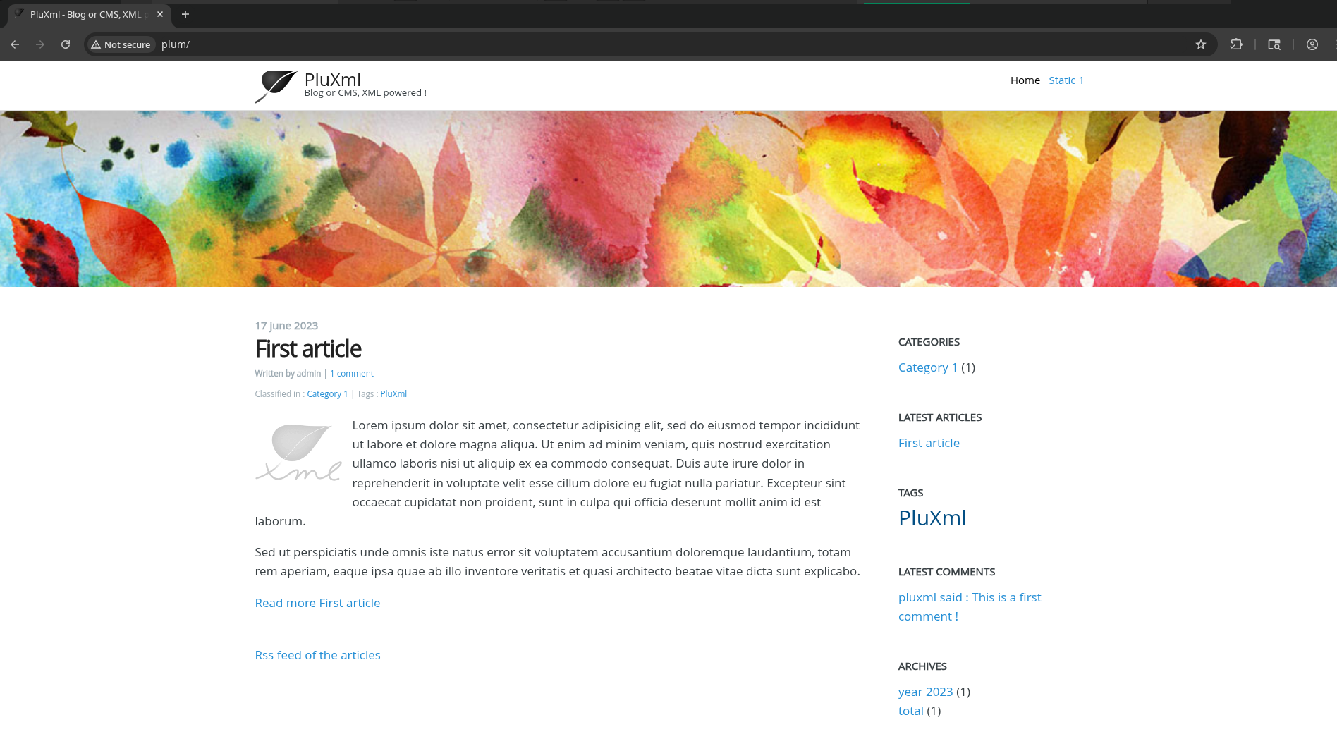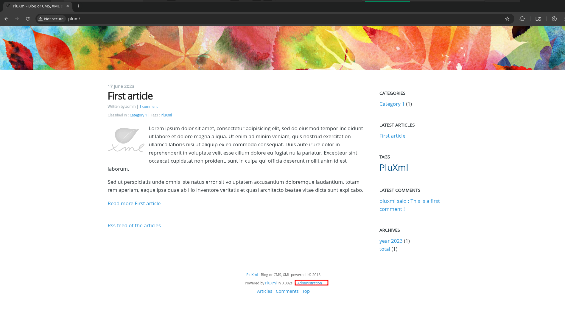 The HTTP title and our scans from autorecon suggest that this is an instance of PluXML: https://www.pluxml.org
