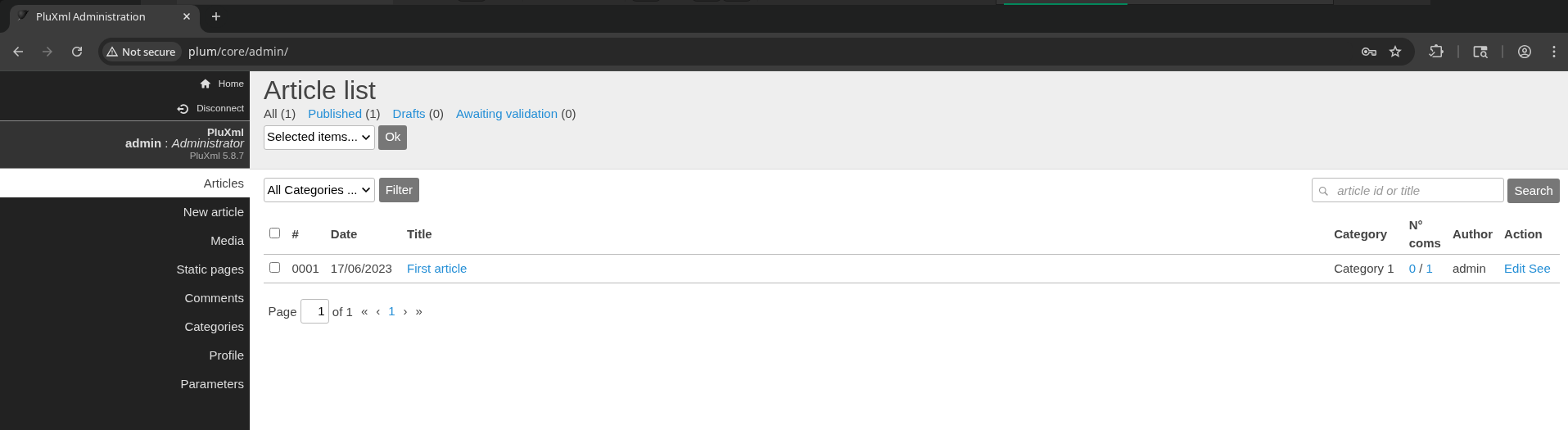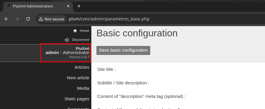The top left, under “Disconnect” shows that we’re signed in as the administrator and that this is PluXml version 5.8.7.